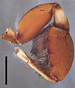 Fig.: F-33187Indomarengo likaliku - ♂ - left leg I, prolateral view. Scale bar: 0.5 mm