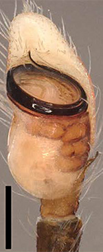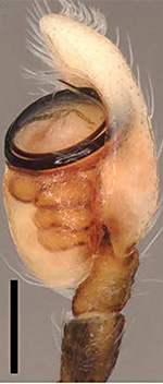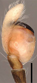 Fig.: F-33189Indomarengo likaliku - ♂ - left palp, ventral view. Scale bar: 0.2 mm