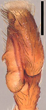 Fig.: D-53043Psenuc lalawa - ♂ - left palp, retrolateral view. Scale bar: 0.2 mm