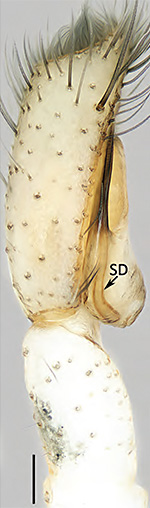 Yaginumaella medog - ♂ - palp, ventral. Scale bar: 0.1 mm