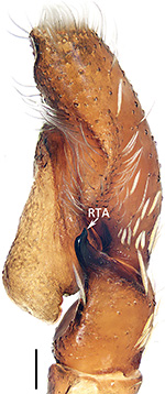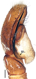 Yaginumaella qomolangma - ♂ - left chelicera, posterior. Scale bar: 0.5 mm