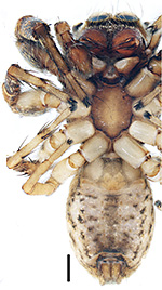 Yaginumaella qomolangma - ♂ - habitus, ventral. Scale bar: 0.5 mm